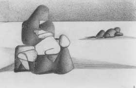 Es folgen die "römischen" Arbeiten Barths aus den Jahren 1938/39, als der Künstler nach dem Erhalt des Cornelius−Preises ein Jahr in der Villa Massimo in Rom weilte und sich (nicht ohne aktuellen Zeitbezug) der Darstellung der Ruinenlandschaft abendländischer Kultur widmete. |